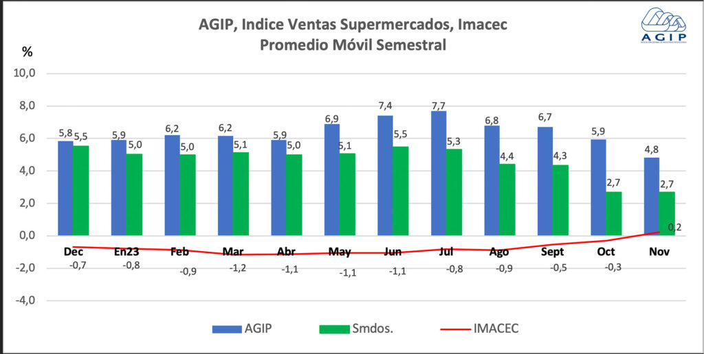 El gráfico compara la variación de los índices AGIP, Ventas de Supermercados y el Imacec.